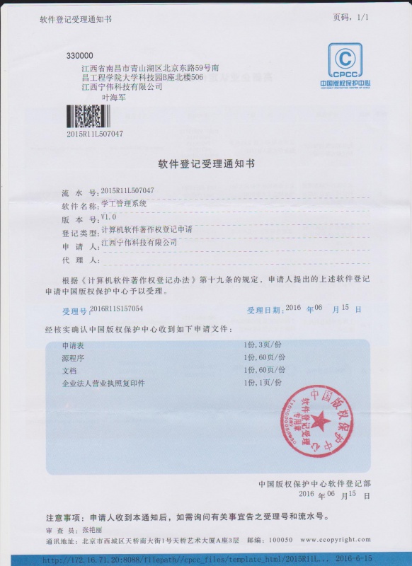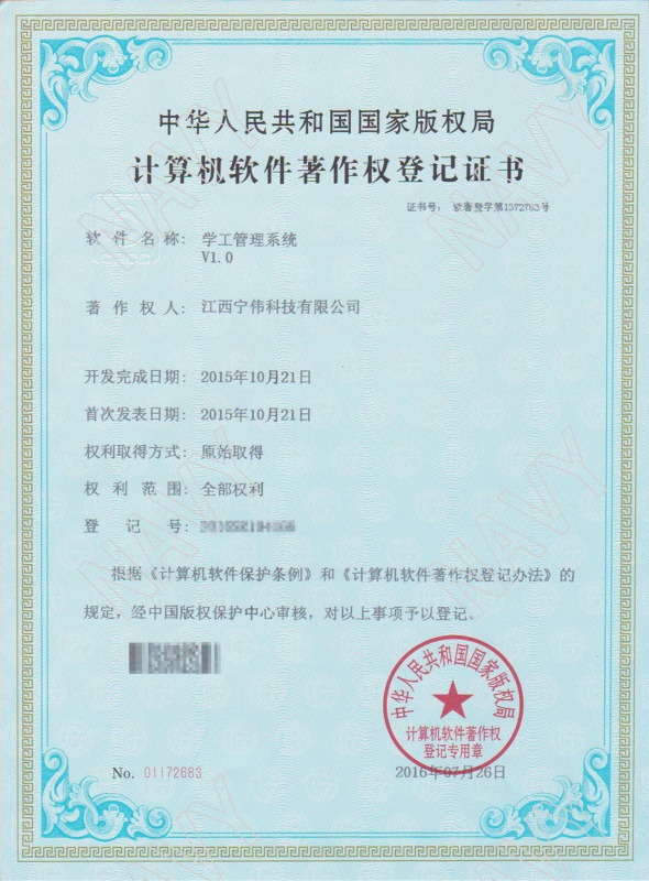 中華人(rén)民(mín)共和(hé)國(≥' guó)國(guó)家(jiā)版權局根據☆ ©《計(jì)算(suàn)機(jī)軟件(jiàn)保護條例》和(hé)《計∏→(jì)算(suàn)機(jī)軟件(jiàn)著作(zuò)權登記辦法》的¥€(de)規定,于2016年(nián)07月(yuè)26日(rì)對(duì)《學工≥₹(gōng)管理(lǐ)系統》軟件(jiàn)産品,予以登記并頒發計(jì)算δ¥™(suàn)機(jī)著作(zuò)權登記ε≤書(shū)。證明(míng)《學工(gōng)管理(lǐ)系統》軟→∑<♦件(jiàn)産品以原始取得(de)的(de)方式取得(de)全部計(jδαì)算(suàn)機(jī)著作(zuò)權權利。